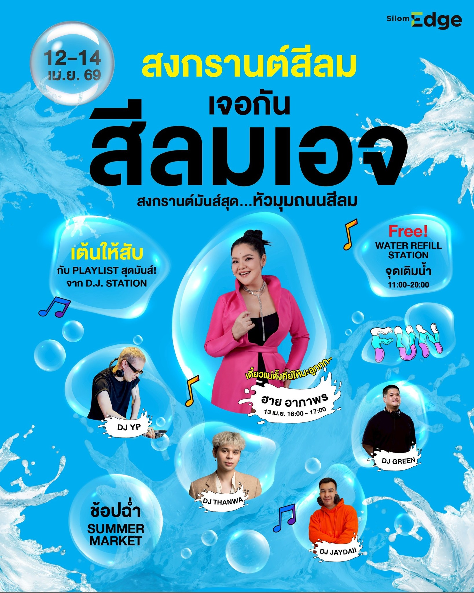 Non-stop fun at the corner of Silom Road! A gathering spot for party lovers, featuring a free water refill station, water play, food, and drinks all in one place. This year’s highlight is a live concert by Hi Apaporn at Silom Edge on April 13, 2026, from 4:00–5:00 PM.Location: Silom Edge
